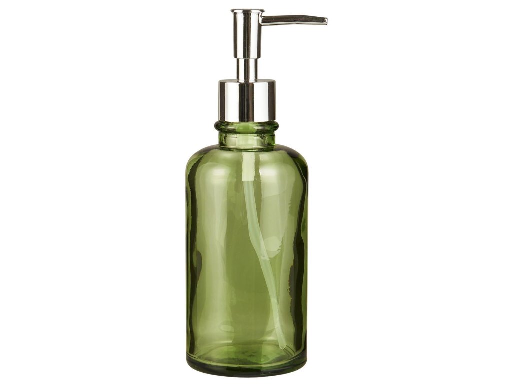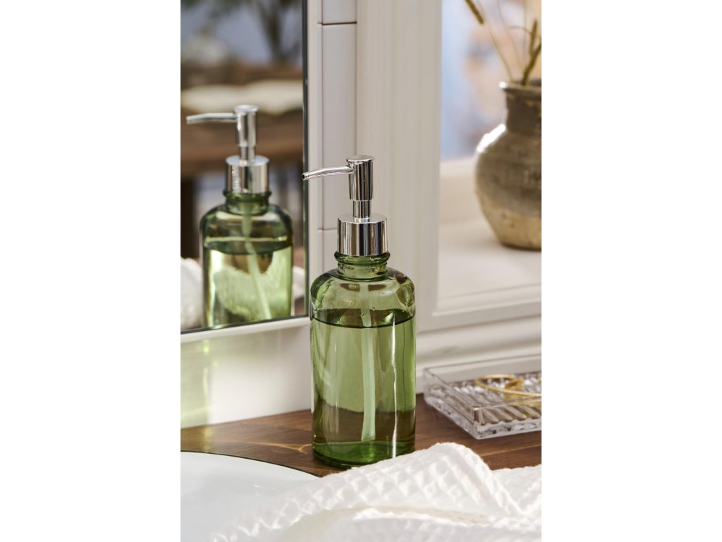 Dávkovač mýdla ze zeleného skla se stříbrnou pumpičkou