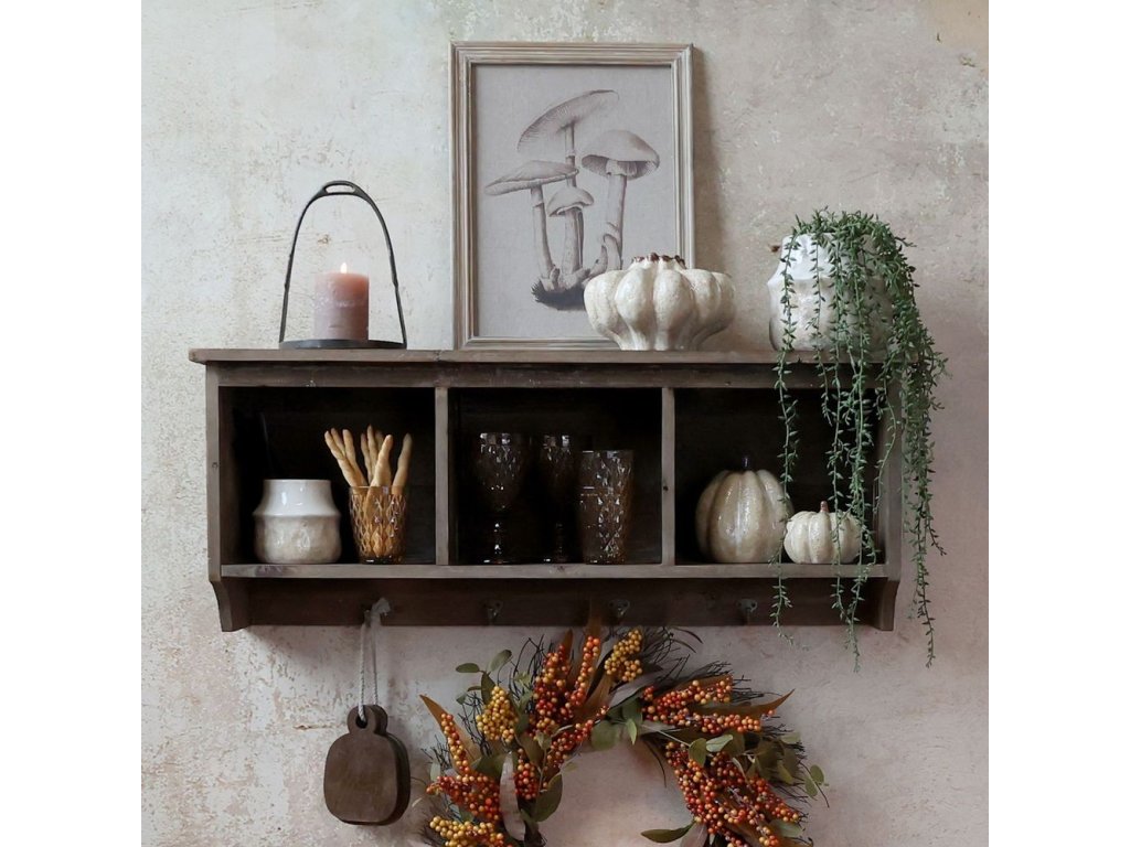 Dřevěná police se 4 háčky je krásným a praktickým doplňkem, který vnese do interiéru nejen funkčnost, ale i útulnou atmosféru. Je vyrobena z kvalitního dřeva v barvě starého dřeva, která dodává celé polici autentický vintage vzhled a přirozenou patinu. Díky rozměrům 91x36x22 cm nabízí dostatek prostoru na odkládání a vystavení různých dekorací, nádobí či drobností, zatímco čtyři pevné háčky umístěné ve spodní části poskytnou praktické místo na zavěšení kuchyňských utěrek, hrníčků, klíčů, kabátů nebo doplňků.