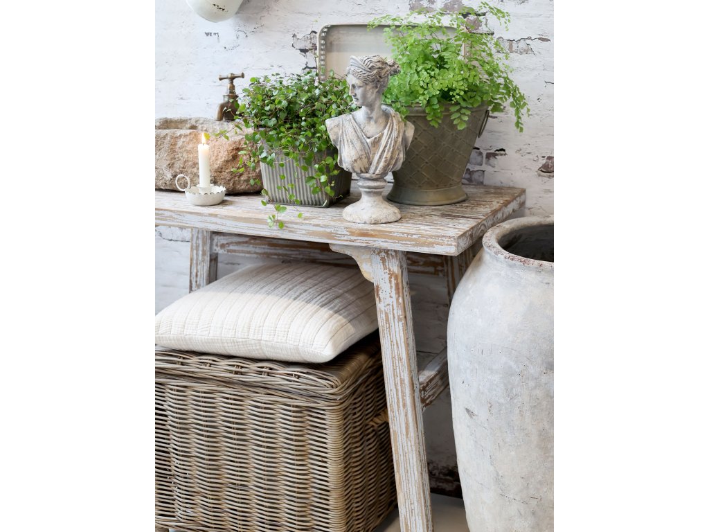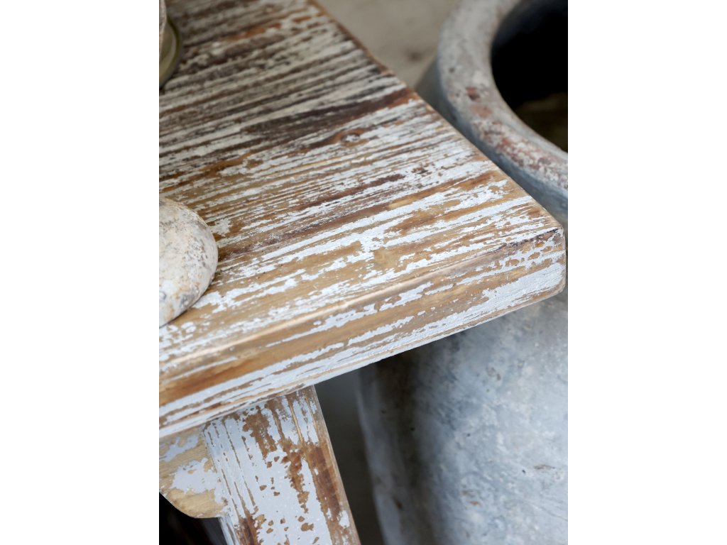 Vyrobený je z kvalitního borového dřeva, které zajišťuje pevnost a dlouhou životnost. Povrch s bílou patinou dodává stolku osobitý vzhled a působí elegantně i útulně zároveň. Tento stolek skvěle vynikne v interiérech laděných do provensálského, venkovského nebo shabby chic stylu, kde podtrhne atmosféru domova.