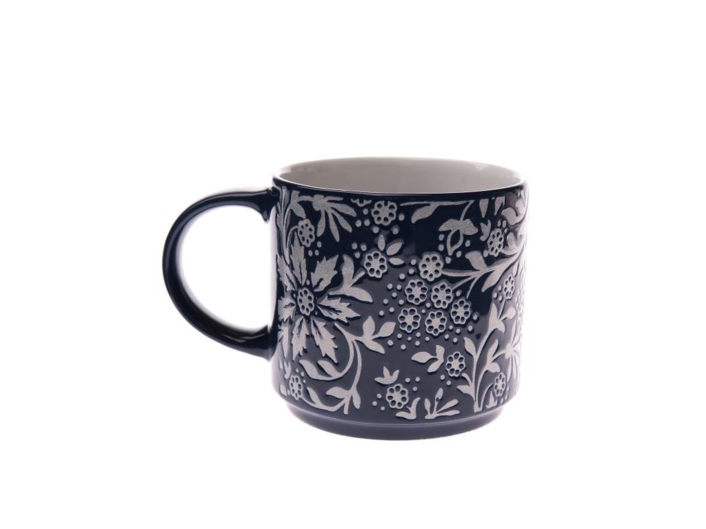 Keramický zdobný hrnek v modré barvě je krásným a praktickým doplňkem pro každodenní používání. Jeho elegantní design s jemným dekorem působí nadčasově a snadno se kombinuje s dalšími kousky nádobí. Díky objemu 390 ml je ideální na kávu, čaj nebo horkou čokoládu.