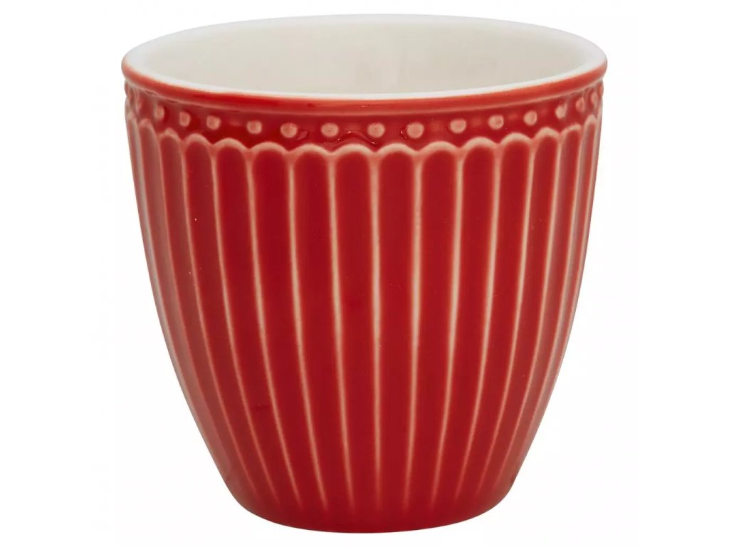 Pro milovníky jednoduchosti a elegance, kteří se nechtějí obklopit pestrobarevným porcelánem, je zde nadčasová kolekce Alice dánské značky GreenGate, jenž nabízí širokou škálu zajímavých kousků. Hrnek na latté bez ouška je se zajímavým vroubkovaným vzorem v červené barvě. Hrnek můžete použít na espresso i jako malý květináč na sukulent nebo jarní kvítka. Tato čistá linie jistě potěší každého z vás. Keramický šálek značky GreenGate se skvěle hodí pro servírování čaje nebo kávy. Je vhodný do myčky i mikrovlnné trouby. Všechny výrobky z této řadou mohou mít barevnou odchylku díky ruční výrobě, což není známka vady. Rozměry jsou 7×7 cm. Objem je 100 ml.