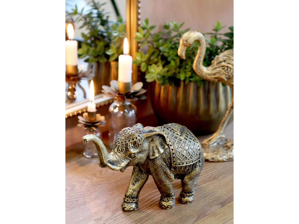 Materiál z umělé pryskyřice zajišťuje pevnost a dlouhou životnost, přičemž zachovává jemné detaily zpracování. Soška může sloužit jako samostatná dekorace, ale také se dobře kombinuje s dalšími ozdobnými prvky, například se svícny, knihami nebo rostlinami. Symbolika slona navíc bývá spojována se štěstím, moudrostí a ochranou domova, takže kromě estetické funkce může přinést i pozitivní energii do prostoru.