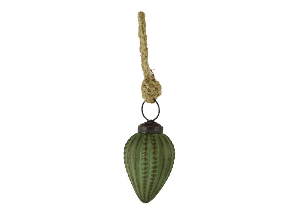 Vánoční skleněná ozdoba ve tvaru malé šišky v zelené barvě s patinou je jemnou a stylovou dekorací, která vnese do vašeho domova sváteční a přirozenou atmosféru. Patinovaný povrch dodává ozdobě vintage vzhled a zvýrazňuje její tradiční charakter.